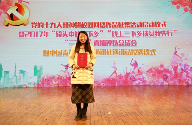 12月26日,由团中央学校部、团中央网络影视中心主办,中国青年网、新华网、“三下乡”官网联合承办的2017年全国大中专学生“三下乡”暑期社会实践“镜头中的三下乡”颁奖仪式在北京举行,团中央网络影视中心党委副书记、常务副主任、中国青年网总裁郝向宏,团中央学校部副巡视员王良等相关领导出席大会。学校在“镜头中的三下乡”评选活动中喜获佳绩。路敏等3位教师获得“优秀指导老师”称号,李阳等3名同学获得“优秀通讯员”称号,“爱之翼”文化宣传服务团获得优秀视频奖,“暖心向young”志愿服务队等4支实践团队获得优秀报道奖和优秀摄影奖。