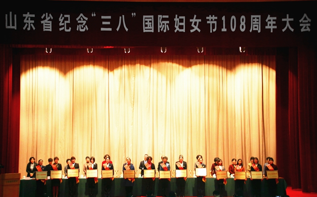 近日,山东省纪念“三八”国际妇女节108周年大会在济南南郊宾馆俱乐部礼堂隆重召开。省委常委宣传部部长王清宪、省人大常委会副主任齐涛、副省长王书坚、省政协副主席王修林、省市妇联干部代表及驻济各界妇女代表500余人参加会议。大会由省妇联主席、党组书记张惠主持。
