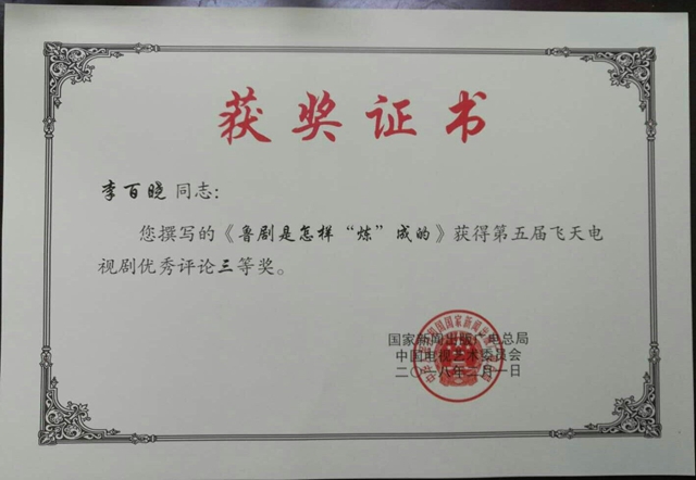 4月3日,中国广播影视大奖?电视剧“飞天奖”颁奖盛典在宁波举行。我校文化传播学院副院长李百晓博士撰写的《鲁剧是怎样“炼”成的》一文获得了本届飞天电视剧优秀评论三等奖。