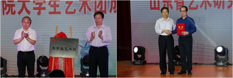 仪式上,盛国军为张积强颁发学校“客座教授”聘书,刘敏、盛国军、张积强分别为学校“大学生艺术团”、“山东省艺术研究院非遗传承研究基地”揭牌,并向学校音乐学院院长宋小霞教授授牌。