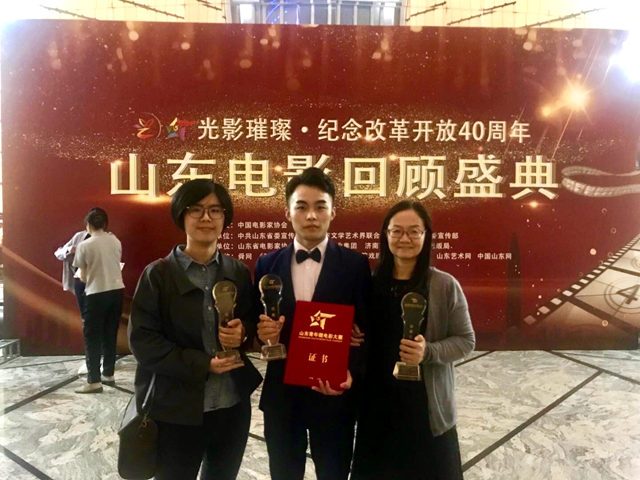 第十一届山东青年微电影大赛颁奖典礼暨“光影璀璨·纪念改革开放40周年”山东电影回顾盛典于9月29日晚在山东省会大剧院举行。本次盛典晚会不仅回顾了改革开放40年来山东电影的经典佳作,还见证了新时代年轻电影人的靓丽风采。我院2017级数字媒体技术(虚拟现实)专业林立坤同学创作的《慕羊人》、《小琪》分别获得故事片类一等奖与三等奖,并获得优秀编剧奖与优秀摄影奖。