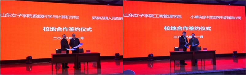 为进一步落实国家及山东省乡村振兴战略规划,全面深化校地校企融合,实现高校专业优势、人才资源与地方经济社会发展精准对接,11月6日,工商管理学院、数据科学与计算机学院、学校科技产业管理处(服务地方办公室)等相关负责人赴莱州市郭店镇小草沟村进行座谈交流,并分别与郭店镇人民政府及小草沟乡村旅游开发有限公司签订了战略合作协议。