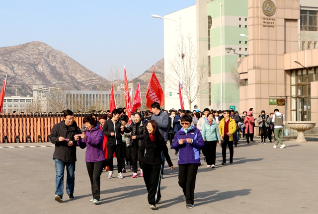 该活动从学校南门出发,沿大学路辅道行进,到紫薇路途经西门站点和北门站点,至居里路前行到大学路进入学校南门,返回学校操场东北门,活动全程3公里。行进过程中设置了先进性别文化宣传、猜谜语、脑筋急转弯等游戏答题环节,增加了趣味性。沐浴着春光,树木含翠、樱花怒放,教职员工们精神抖擞,有的一边沉思答题,一边健步快走;有的一边互相交流讨论,一边活动筋骨,大家既丰富了知识,又锻炼了身体,欢声笑语洒满女院。本次参加活动人数达到全校教职工总人数的95%。