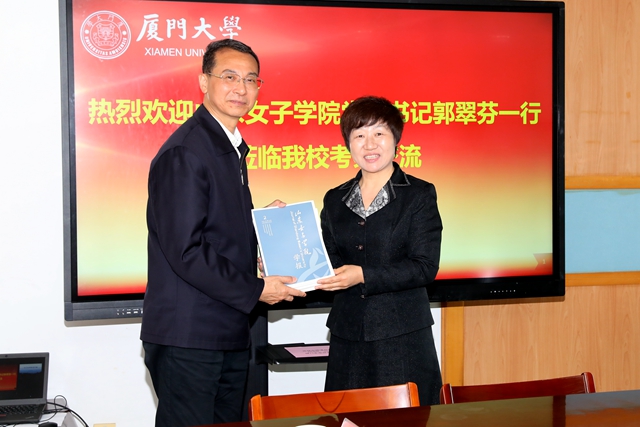4月16日下午,厦门大学党委副书记、纪委书记赖虹凯热情接待了郭翠芬一行,并举行了座谈会。座谈会上,赖虹凯简要介绍了该校的发展历史及办学特色。郭翠芬对该校的热情接待表示感谢,并指出,厦门大学办学历史悠久,办学理念、管理模式先进,为我校推进高质量特色发展提供了宝贵经验。校党委委员、组织部长孙理从发展历程、办学传统、办学特色等方面介绍了该校的情况。双方还围绕基层党组织建设、党风廉政建设、校园文化建设以及妇女/性别研究与培训基地发展等议题展开对口交流。会后,郭翠芬一行参观了该校校史馆,并实地考察了校园环境建设。