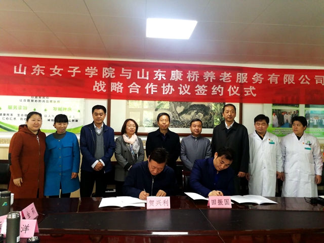 座谈结束后,盛国军与田振国共同为“山东女子学院实习就业双基地”、“山东省健康养老研究中心实践基地”揭牌。贺兴利代表学校与山东康桥养老服务有限公司签署了校企战略合作协议。