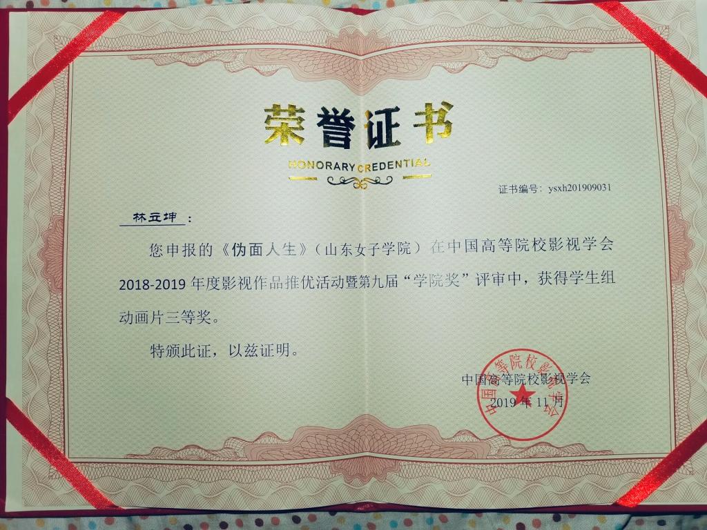 11月1日-3日,中国高等院校影视学会第十九届年会暨第十二届中国影视高层论坛于山东师范大学召开,来自北京师范大学、中国传媒大学等全国近200所高校的500多位专家学者参会。期间举行了第九届“学院奖”颁奖仪式,我校数据科学与计算机学院数字媒体技术专业林立坤、廖若晨同学创作的《伪面人生》获“学院奖”三等奖。