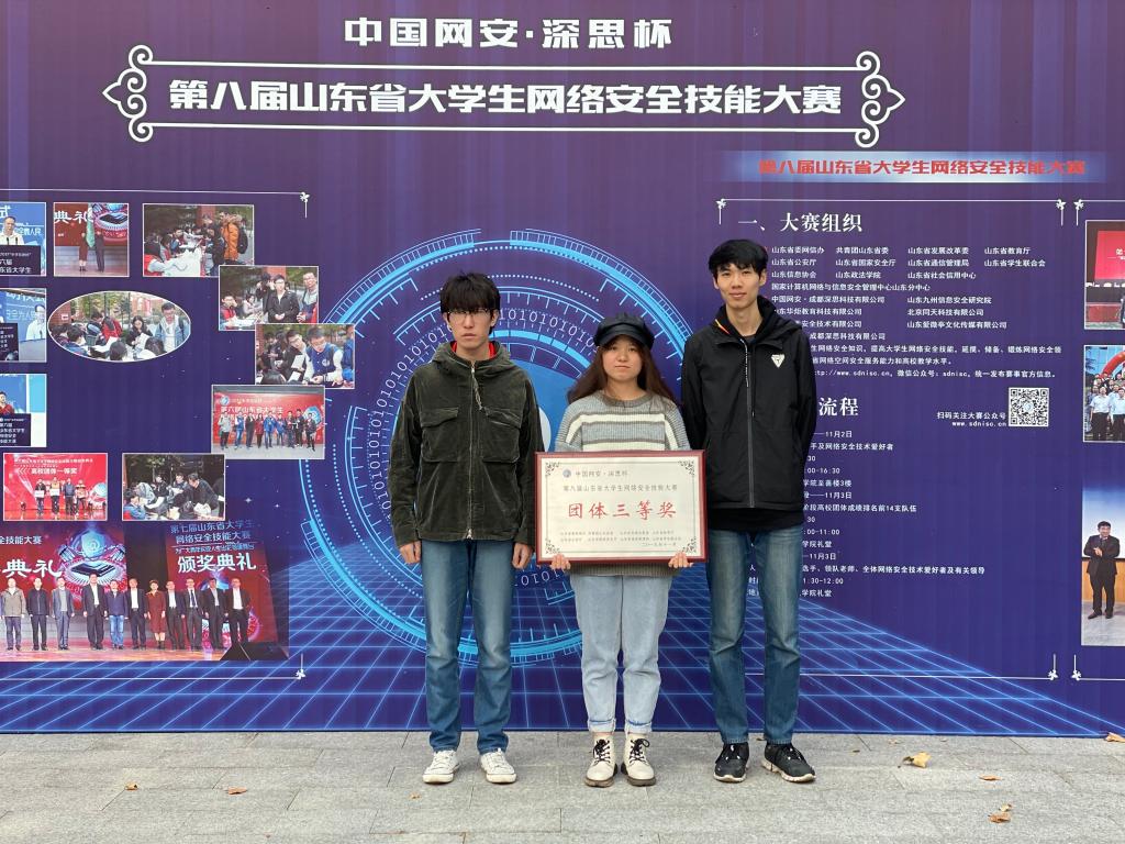 2019年第八届“深思杯”山东省大学生网络安全技能大赛近日在山东政法学院举行。由数据科学与计算机学院杨艳春老师带队,吴迪(2017级计算机科学与技术-普本)、王鹏(2018级计算机科学与技术-专升本)、李梦新(2018级计算机科学与技术-普本)三位同学组成的比赛团队参加了本次大赛。经过紧张角逐,团队获得了三等奖的好成绩。