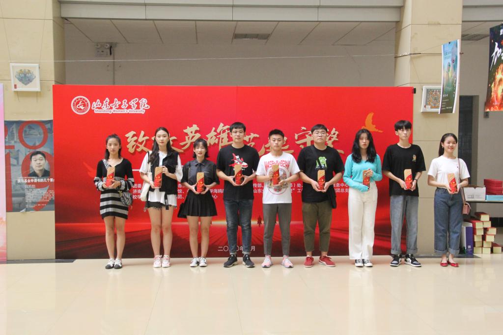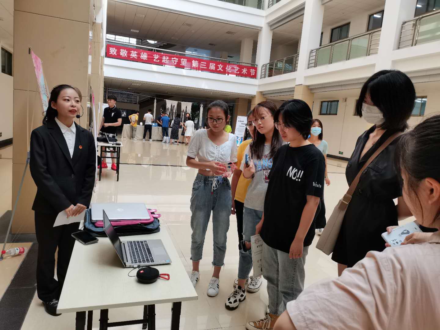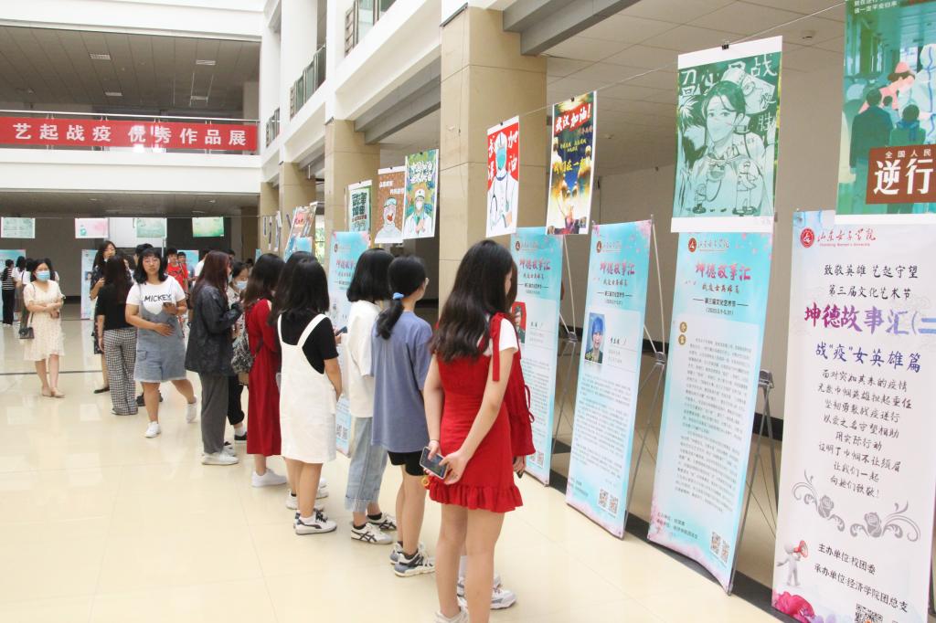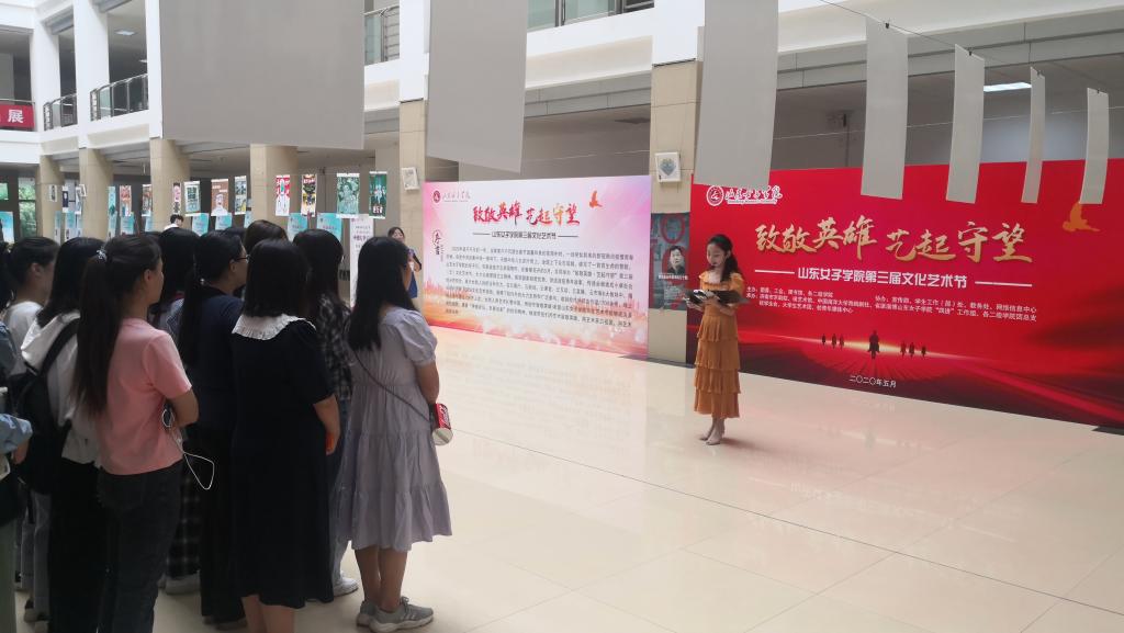 展播分为艺术作品实物展、艺术作品图片展、比赛作品视频展、故事音频广播展、“我爱我的国”微团课五个模块。在简短的文化艺术节颁奖仪式后,观展同学依次参观学习。在艺术作品展览中,女院师生用艺术创作表达了对生命的尊重和对英雄的敬仰,讴歌新时代的巾帼女英雄,传递正能量;比赛作品视频展播中,女院学子以云合唱、微视频、Vlog等多种形式真实记录疫情下的美丽中国;故事音频广播展播讲述了女院青年在战疫一线的所见所感,传递对祖国的歌颂和热爱以及对战疫必胜的信念;“我爱我的国”团总支书记微团课,则是由各学院团总支书记通过讲述爱国故事,大力唱响礼赞新中国、奋进新时代的青春主旋律……在讲解员的讲解下,同学们对展播作品有了更深入的了解,特别是在观看战疫英雄陈薇院士的事迹后,同学们深受触动,教育学院徐嘉翎同学表示,“我要向巾帼英雄们看齐,学习她们勇于担当、拼搏奉献的精神,努力活成一道光,照亮自己,温暖别人。”