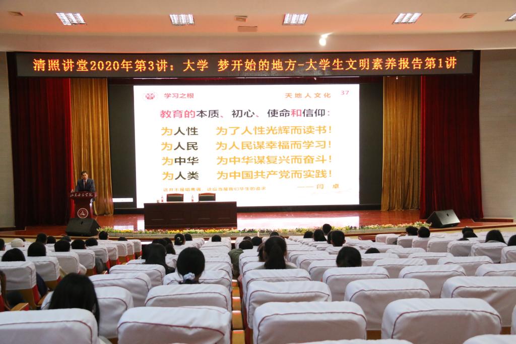 10月23日下午,清照讲堂2020年第三讲暨大学生文明素养报告“大学——梦开始的地方”在图书馆二楼报告厅举行。主讲嘉宾莱芜新时代宣讲团团长闫卓、300余名师生代表现场聆听报告。