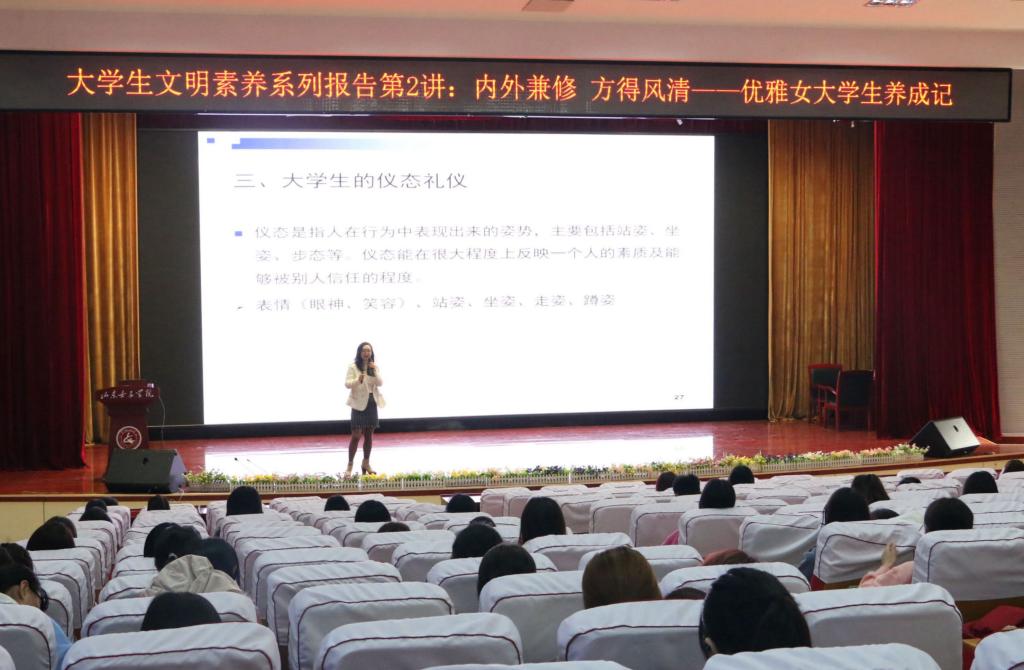 11月3日下午,由学生工作(部)处主办的大学生文明素养系列报告第2讲在图书馆二楼报告厅举行。报告以“内外兼修 方得风清——优雅女大学生养成记”为主题,邀请旅游学院刘莹老师作为主讲嘉宾,学生工作处负责同志主持,100多名同学聆听了此次报告。