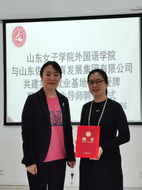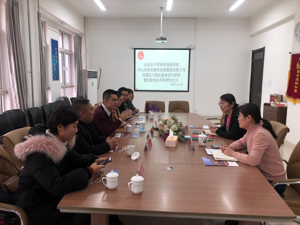 11月26日,外国语学院与山东佐佑教育发展集团有限公司在博雅楼A403举行“实习就业基地签约授牌暨创新创业导师聘任”仪式。佐佑教育CEO张鹏、董事长王倩、外国语学院院长赵淑容等参加仪式。