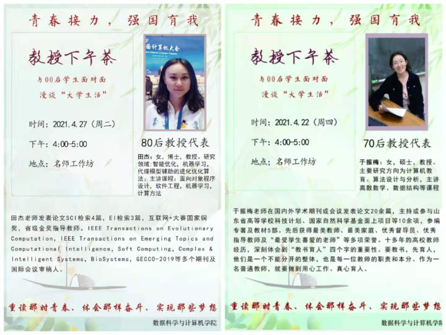习近平总书记在纪念五四运动100周年大会上指出,无论过去、现在还是未来,中国青年始终是实现中华民族伟大复兴的先锋力量。“青春接力,强国有我”教授下午茶是数据科学与计算机学院开展党史学习教育的特色活动之一,下一步,该学院还将陆续开展“回眸历史,亮剑青春”不同年代教授讲高考、不同年代党员讲入党故事等,教育引导青年学生从不同年代的大学生求学和成长故事中感受“小我”与“大我”,凝聚新时代学子同心向党、接续奋斗的磅礴力量。