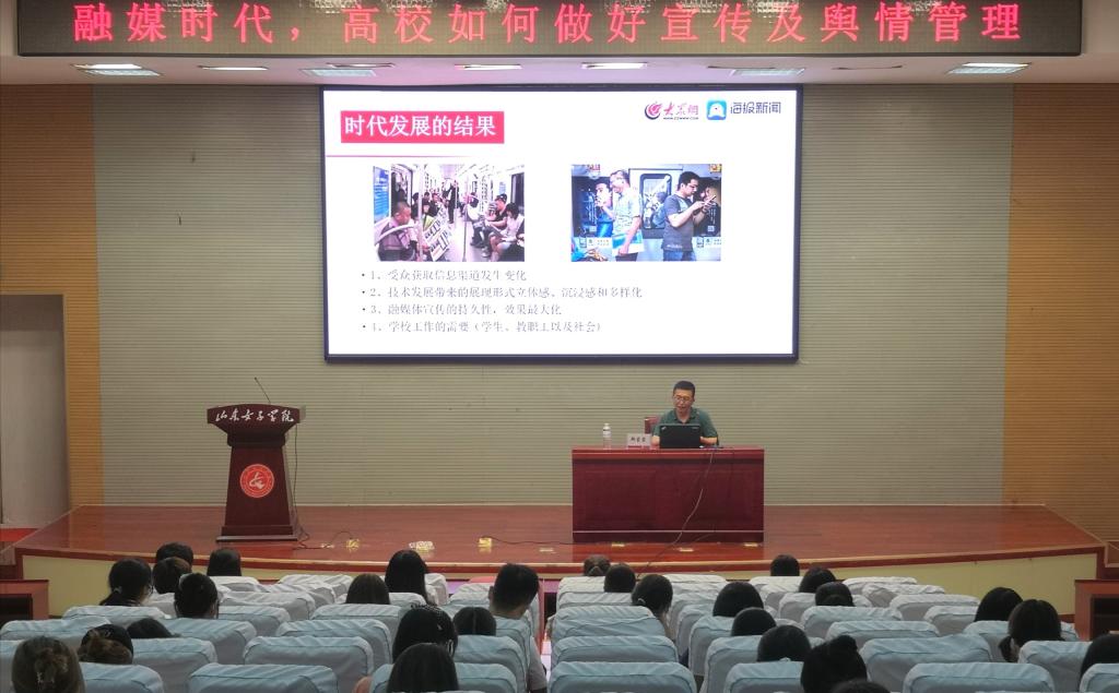 为了进一步提高学校通讯员的专业素养和业务水平,6月17日下午,学校在图书馆一楼报告厅举办2021年通讯员培训会。会议邀请大众网海报新闻教育频道运营总监郑蒙蒙做《融媒时代,高校如何做好宣传和舆情管理》报告,各部门、单位通讯员等参加会议。