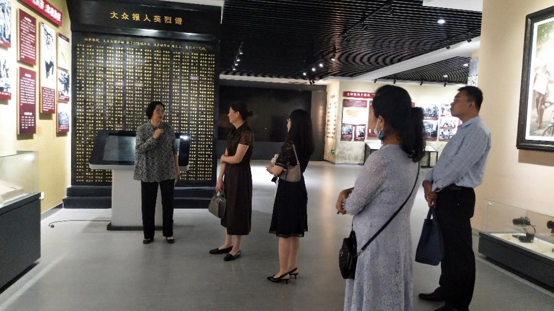大众日报社报史馆长于岸青和集团办公室负责对我校教师代表表示热烈欢迎。于馆长首先带领参观了报史馆,详细介绍了展馆中重大新闻报道、关键历史事件。一幅幅新闻照片展示着往日的革命辉煌,一件件珍贵的实物资料承载着厚重的红色记忆,一幕幕艰苦卓绝的历史画卷叙说着新闻人的荣耀与自豪。老师们认真聆听讲解,并就山东妇女运动的发展问题同于馆长进行了深入交流。