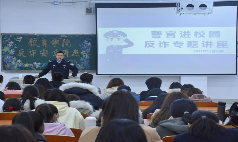 警校联手齐共建,反诈宣传进校园。为进一步加强校园反诈教育宣传力度,提高大学生的防诈意识,11月16日,教育学院举行 “警察进校园”反诈专题讲座,特邀长清公安分局杨克警官主讲,教育学院辅导员和学院全体班级安全委员及宿舍长参加。