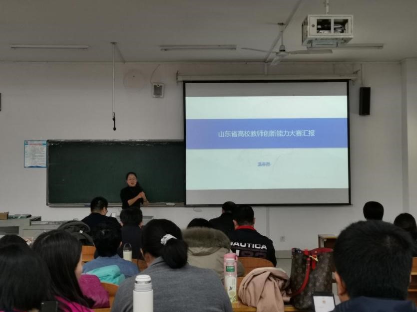 温春然老师向全体教师分享山东省高校教师创新能力大赛经验。温老师通过申报书、教学创新成果报告、实录材料和现场汇报四个方面详细介绍了比赛的准备过程,并叮嘱老师们要研读相关文件。随后温老师以《金融学》为例,介绍了课程背景,分析了课程面临的痛点问题,展示了课程创新理念与思路,即重构知识、能力和情感教学目标,重构专业知识融合思政元素、基础理论融入学术前沿、“线上+线下”授课的教学内容,重构“三位一体”的课程评价体系。温老师表示要将最新研究成果或思政内容引入教学内容,重构、完善专业教学课程体系,加强课程系统化。