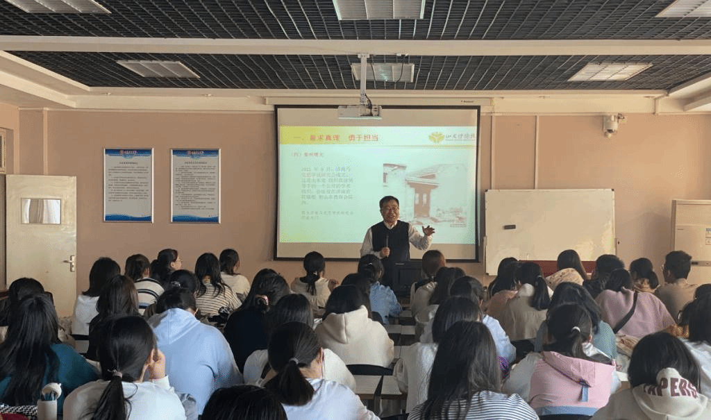 伴随着学生们热烈的掌声,孙友德开启了他的讲座。他介绍到,山东是革命老区、红色热土,有着光荣的革命历史和革命传统,更是留下了许多弥足珍贵的实物史料和革命旧址,值得我们好好学习。通过对革命前辈们使用过的茶缸、毛毯、信件等物品做了细致的介绍,深入挖掘文物背后有血有肉的人物和感人至深的故事,让学生们深刻理解到革命先烈崇高的信仰和不朽的牺牲精神。随后,孙友德表示文物是历史时期的缩影,隐藏着丰富的社会历史信息。他强调当代青年应深入学习党史,做到学史明理、学史增信、学史崇德、学史力行,努力成长为担当民族复兴大任的时代新人,接续谱写新的时代华章,并对学院学生发出了真诚的邀请欢迎到山东省博物馆参观学习交流。