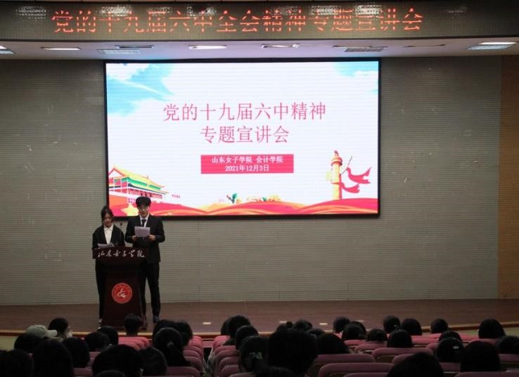 为进一步强化“青年马克思主义者培养工程”的培养培训力度,深入学习贯彻十九届六中全会精神,引导青年团员听党话、跟党走,12月3日晚,会计学院邀请山东师范大学历史文化学院党史学习教育学子宣讲队举办党的十九届六中全会宣讲会,学院学生党员和团员代表170人现场聆听学习。