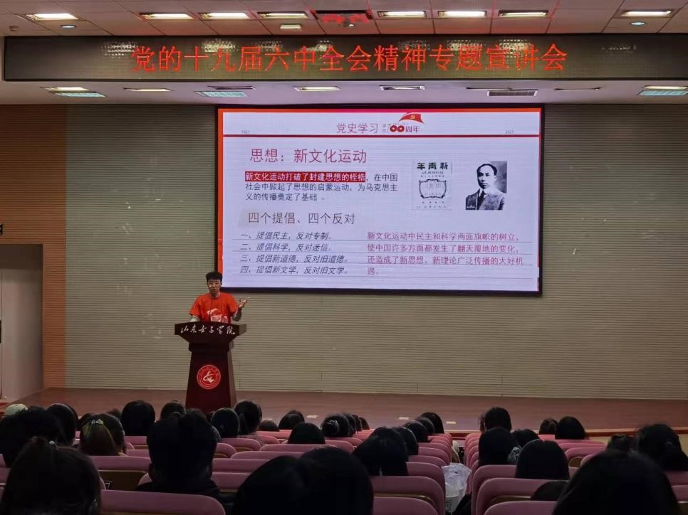 宣讲会上,来自山东师范大学历史文化学院党史学习教育宣讲队的成员以“中共一大中国共产党初心起点——解读十九届六中全会精神”为题,带领青年学生回顾了中国共产党波澜壮阔的百年奋斗历程,重点讲解了十九届六中全会精神,阐释了党的百年奋斗初心使命和重大成就,宣讲主题鲜明,内容丰富,具有很强的指导性。