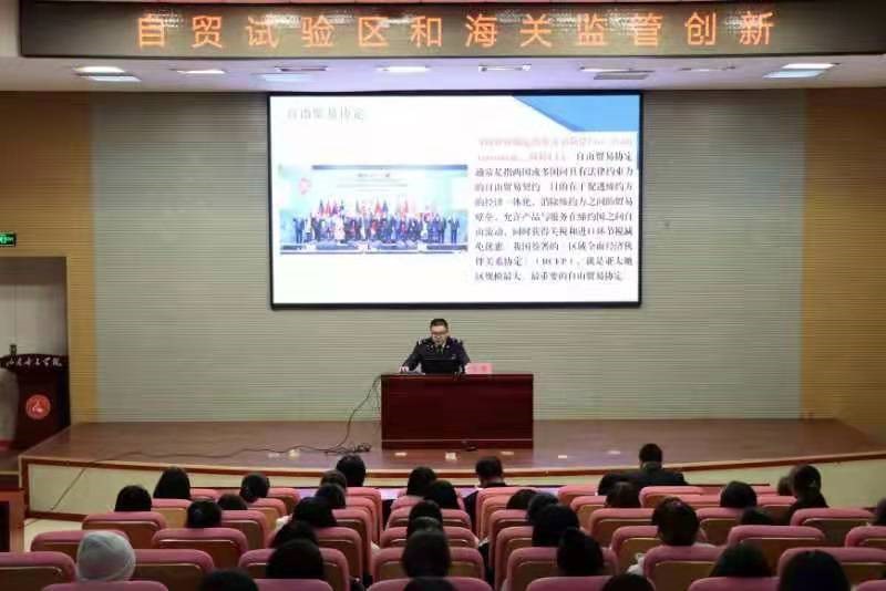 会后,丁睿在图书馆一层报告厅为经济学院国际经济与贸易及报关与国际货运专业的新生做了海关普法宣传讲座,主要介绍了济南自贸区和综保区的工作情况,增强了学生对本专业的认知。