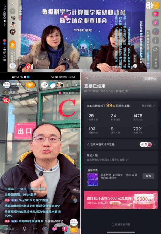 线上会场设在数据科学与计算机学院官方直播间,由魏宝懿老师主持,企业代表在直播间进行云宣讲,并回答因疫情防控要求未能来到现场的同学们提出的问题。本次直播效果良好,点赞次数7921,观众人数1475。本次活动为各个企业安排了线下面试场地,学生通过线上或线下平台了解到企业信息后,可以立即与企业联系,当天进行笔试和面试。本次参加宣讲的10家企业共提供岗位220多个,分别面向软件开发、测试、研发工程师、大数据解决方案经理、平面设计及新媒体运营等多个方向。宣讲会后,现场投递简历的同学有45位进入企业组织的笔试和面试,38位同学到企业参加进一步面试,3位同学现场获得实习邀约,还有120余位同学已经加入公司招聘群,并在进一步沟通中。
