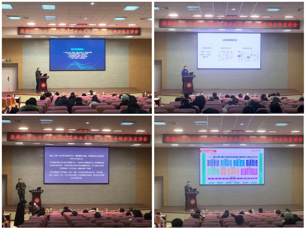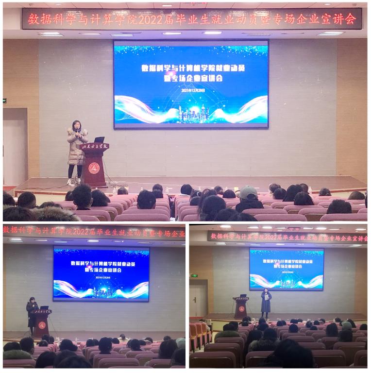 12月29日上午,数据科学与计算机学院首次采用O2O模式召开2022届毕业生就业动员暨专场企业宣讲会,线下会场设在图书馆C座一楼报告厅。学院副院长田杰、大学生就业指导中心主任史科蕾以及2022届150余名毕业生代表,山东亚历山大智能科技有限公司、北方新宇等10家企业代表出席线下会场活动。
