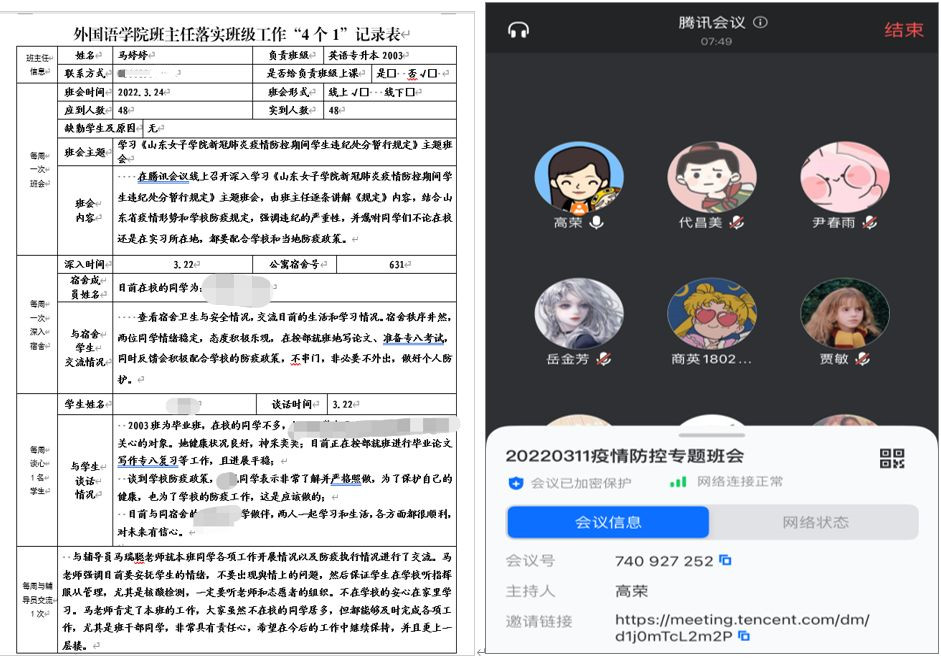 为了凝聚力量做好校园封闭管控下学生教育管理工作的力量,学院实施班主任落实班级工作“4个1”行动,班主任每周召开班会1次、每周深入宿舍1次、每周谈心谈话1个学生、每周与辅导员交流工作1次。自3月16日以来,班主任共召开班会94场次,谈心谈话学生近193人,线上线下深入宿舍291个,工作交流75次。