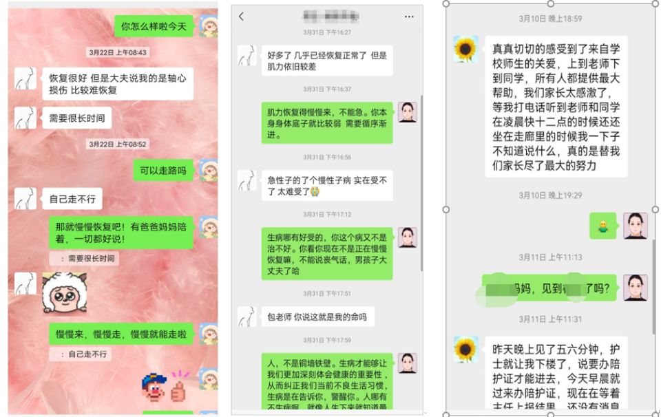 近日,一名学生突发疾病,家长却因所在地处于高风险地区暂时不能来济照顾,焦急万分。为了让远在内蒙古的家长放心,让住院的学生安心,外国语学院辅导员和部分学生24小时昼夜接力,连续5天彻夜不眠地守在病房外,直到学生转危为安,稳妥地将学生交到父母手中。期间,辅导员老师深切理解父母急切心情,随时保持联系沟通。班级同学和室友自发到医院轮流照顾,帮助鼓励学生树立信心战胜病痛。校园封闭管控,虽然不能亲自去医院探望学生,但其他老师和同学们经常通过线上聊天、视频通话等方式关注关爱生病学生,赢得家长赞誉和衷心感谢。