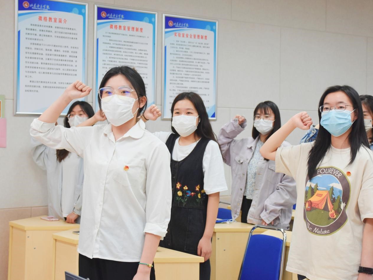 带领大家重温入团誓词。在庄严的仪式中,同学们们高举右拳,面向鲜艳的团旗,庄严宣誓,铿锵有力的誓词凝聚了团学骨干坚定的信念,声声誓言响彻教室,回荡在现场每一位同学心中。