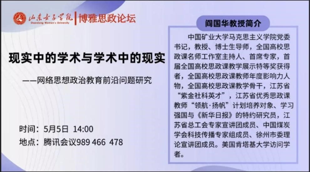 5月5日下午,马克思主义学院举办第五期博雅思政论坛,邀请中国矿业大学马克思主义学院党委书记、博士生导师阎国华教授作题为《现实中的学术与学术中的现实——网络思想政治教育前沿问题研究》的线上专题报告。学院全体教师及其他院系部分教师参加,学院党总支书记王永泉主持会议。