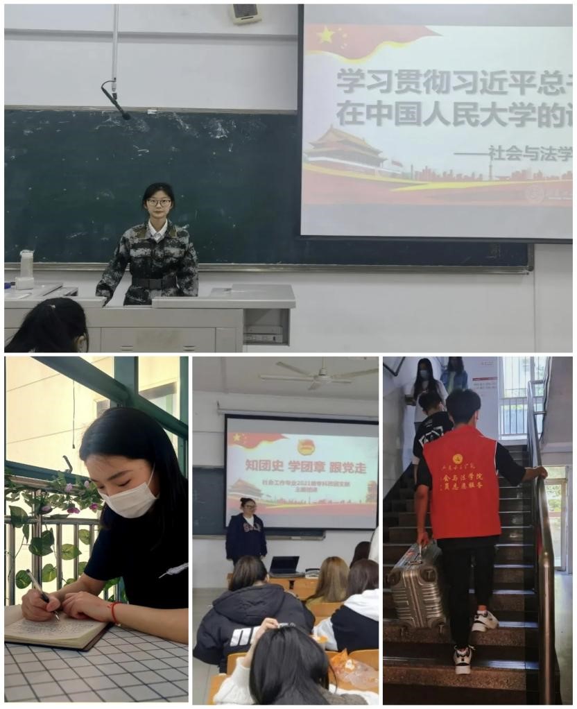 以迎接党的二十大为主线,结合庆祝建团100周年,开展“五四青年节,青春勇担当”主题团日活动,学习习近平总书记青年寄语,积极投身志愿活动。团总支、团支部通过线上线下相结合的方式开展学习,深入学习贯彻习近平总书记讲话精神,带领社法青年学子学习领会习近平总书记寄语的深刻含义,鼓励广大社法青年传承五四精神,牢记党的教诲,立志民族复兴,不负韶华,不负时代,不负人民,勇担责任,争做新时代的新青年。