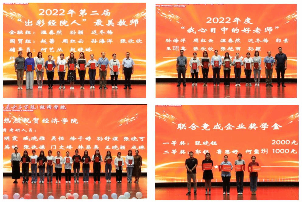 沈传河在典礼伊始发表致辞,他鼓励2022级新生志存高远,执着理想,胸怀大志,做一个自强的奋进者;潜心问学,做一个自律的学习者;创新融通,做一个自为的探索者,为百年女大梦的实现增添新的活力。团委、学生工作处,经济学院、校企合作企业负责人分别为“我心目中的好老师”“出彩经院人”荣誉称号获得教师及优秀考研学生、专业大赛获奖学生、山东省优秀学生(干部)、国家奖学金、联合竟成企业奖学金获奖学生颁奖。