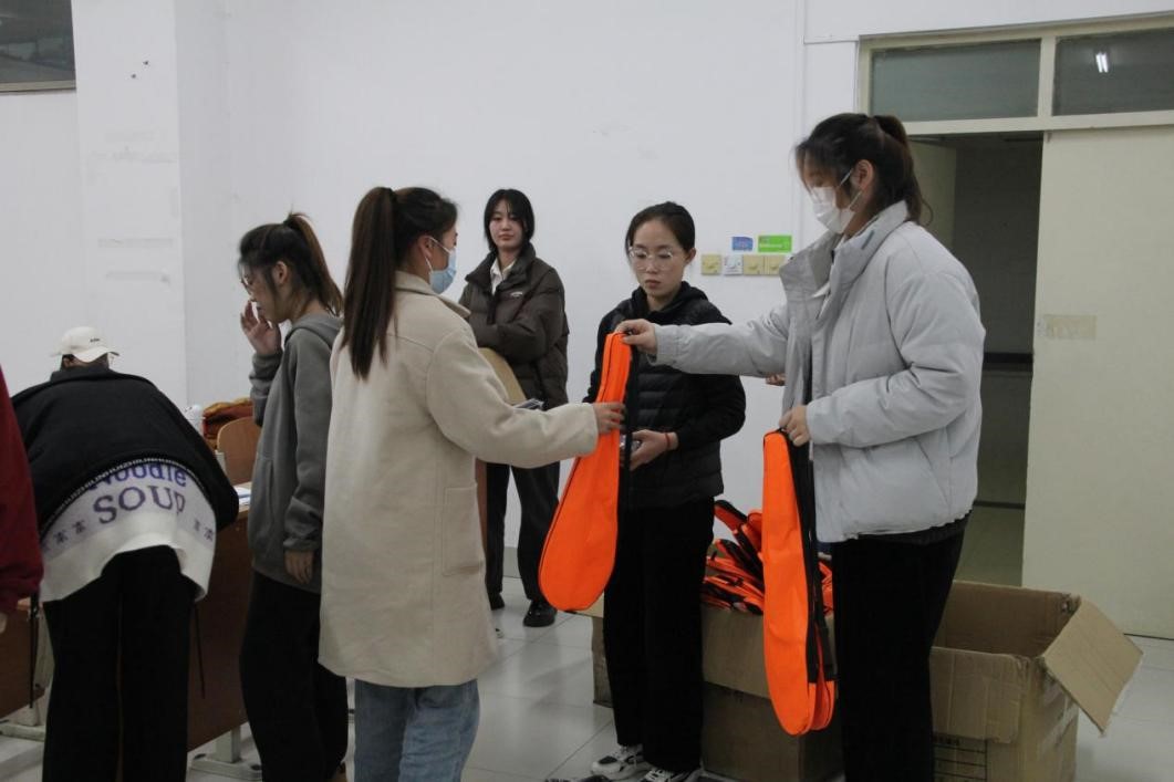 分发物品前,学院生活部的志愿者们就将羽毛球、毽子、跳绳等体育用品进行消毒,然后按照宿舍顺序号进行分发。并倡议大家在严格遵守学校防疫要求的规定下,走出宿舍,走向操场,错峰开展各项体育活动。