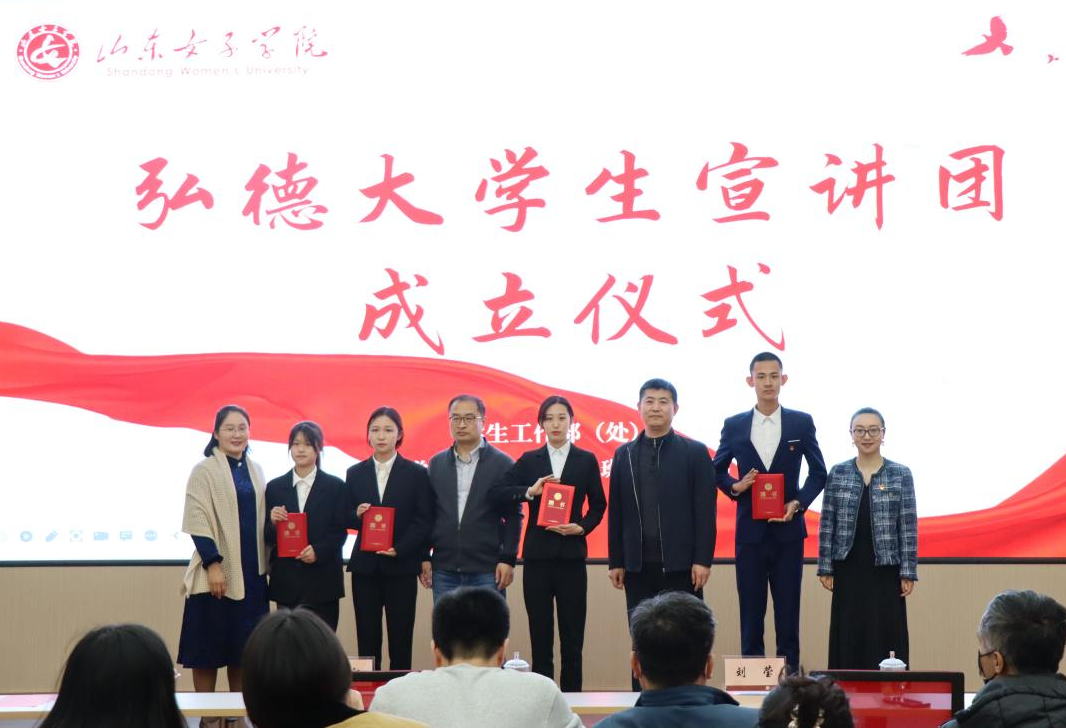 学生处教育管理科负责同志首先从宣讲团成立初衷、工作进展、未来预期三个方面介绍了宣讲团相关情况。与会领导共同按下启动球,宣布弘德大学生宣讲团正式成立并为宣讲团成员颁发聘书。赵丽丽向宣讲团成员提出殷切希望,一是要带头学习理论知识,学深悟透,学以致用;二是要积极学习兄弟高校的先进经验做法和优秀成果,用以指导实践;三是结合学校学风建设要求,通过全面学习宣传贯彻党的二十大精神,引导全校同学树立为国家发展、民族复兴而奋斗的理想信念,明确学习目标,提高学习的主动性和自信心。宣讲团成员代表随后在表态发言中诚挚地感谢了学校教师对大学生宣讲团的辛勤指导,表示今后在理论学习和宣讲中要做到打牢基础、活化形式、贴近事实,并表达了建设好大学生宣讲团的决心。