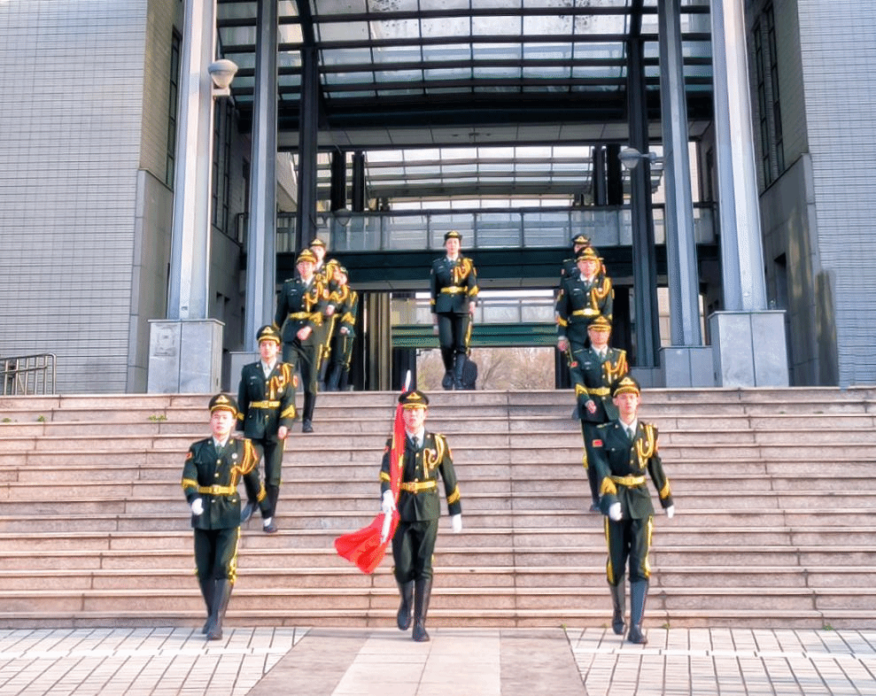 7:30分,主持人盛雅茜宣布升国旗仪式正式开始。庄严的国旗手气宇轩昂,踏着整齐坚定的步伐,伴着《护旗曲》,护卫着鲜艳的五星红旗缓缓入场。