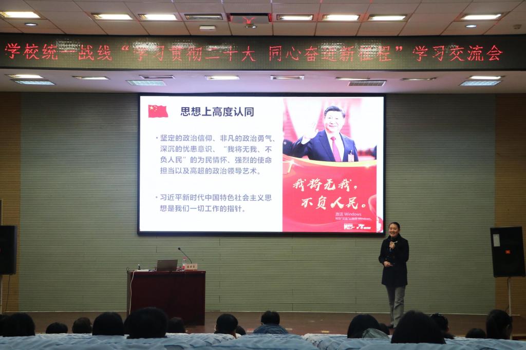 为深入学习宣传贯彻党的二十大精神,引导广大统战成员把思想和行动统一到党的二十大精神上来,把智慧和力量汇聚到学校高质量发展上来,3月23日,学校召开统一战线“学习贯彻二十大 同心奋进新征程”学习交流会。省属高校学习宣传贯彻党的二十大精神宣讲团成员、马克思主义学院副院长石荣菊作专题辅导,与会代表开展学习交流研讨。会议由党委委员、统战部长李君主持。