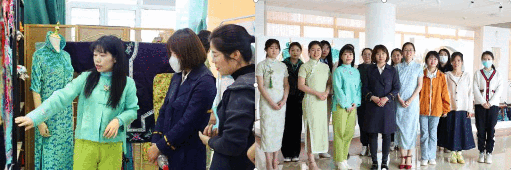 在旗袍小课堂上,高英培老师给旗袍爱好者讲解了清末民国女性服饰、传统旗袍的艺术审美价值,展示了传统旗袍中镶、嵌、绲、盘等工艺特征。在老师的细致示范和指导下,大家在整个参观过程中精神饱满、兴趣浓厚,纷纷感叹中国传统服饰制作工艺的精湛。体验者把传统旗袍穿上身,亲身感受具有传统美韵的手工旗袍,领略了旗袍深厚的艺术文化魅力。