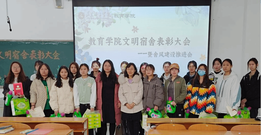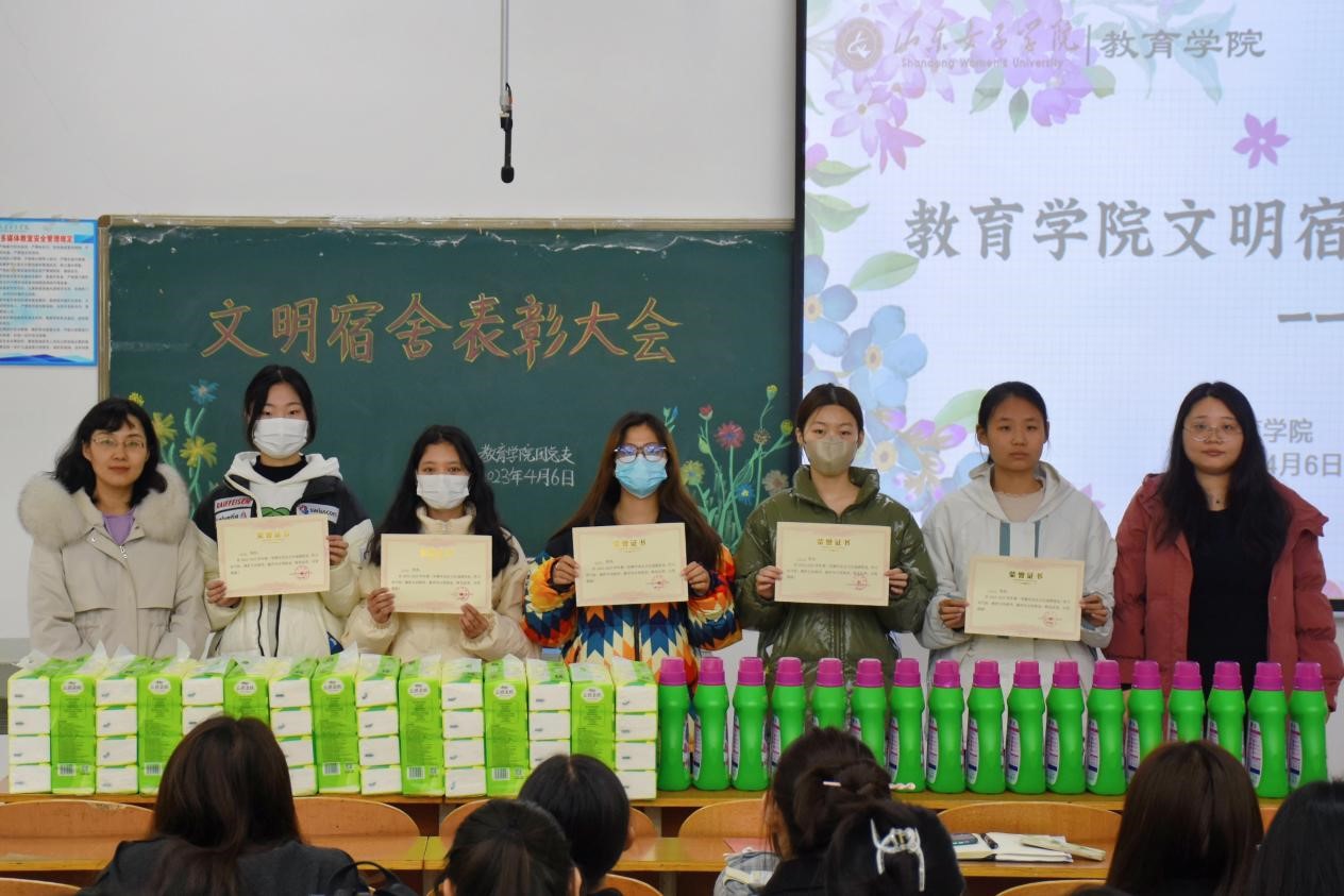 为加强舍风教育,积极营造良好的学习生活环境,教育学院于4月6日在博文楼107举行教育学院文明宿舍表彰暨舍风建设推进会,教育学院党委副书记路敏、辅导员老师贠欣彤、优秀宿舍学生代表参加颁奖仪式。