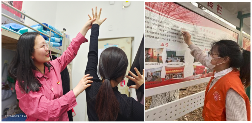 党支部全体党员从身边实际出发,发挥主观能动性,开展形式多样的志愿服务活动。党员赵艺薇和韩晓颖在实习所在地,分别参与了当地社区志愿服务关爱老人活动和辅助交通执勤工作;党员李雅萍在新学期开设舞蹈课程的前提下,帮助班级内舞蹈动作不规范的同学,共同练习并纠正规范动作;党员高佳慧与小组其他党员同志们,共同清扫了公寓楼道内楼梯和学校宣传栏的清洁工作......