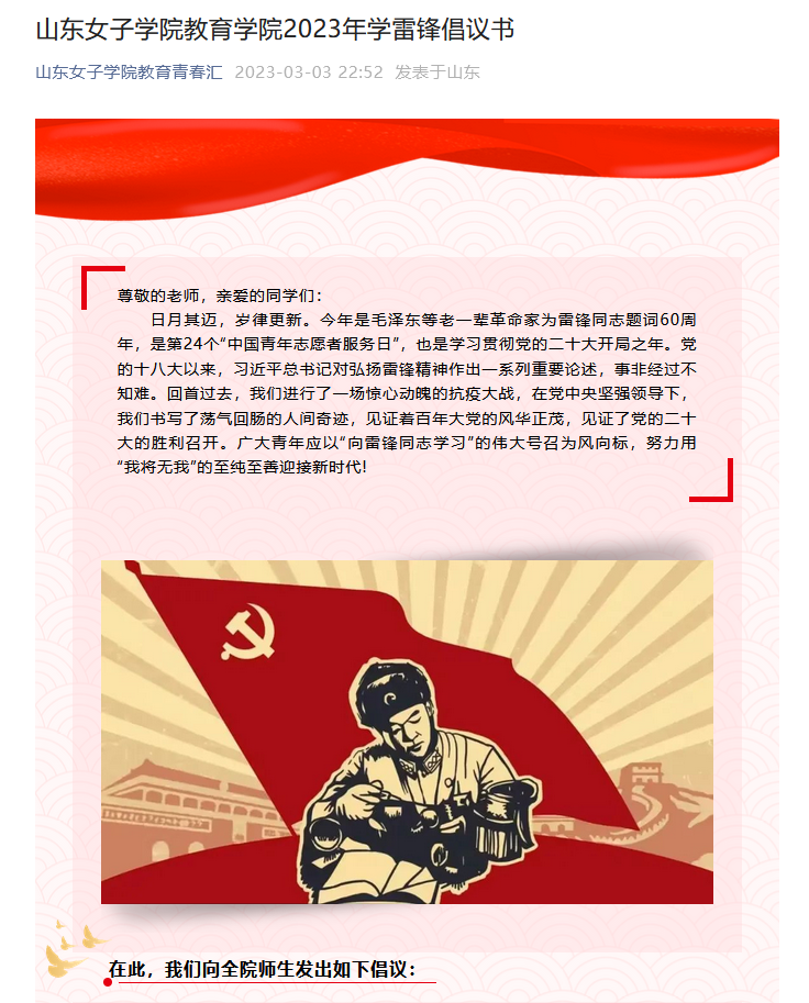 为深刻把握雷锋精神的时代内涵,近日,山东女子学院教育学院举行学习雷锋精神系列活动,营造积极助人无私奉献良好风尚。
