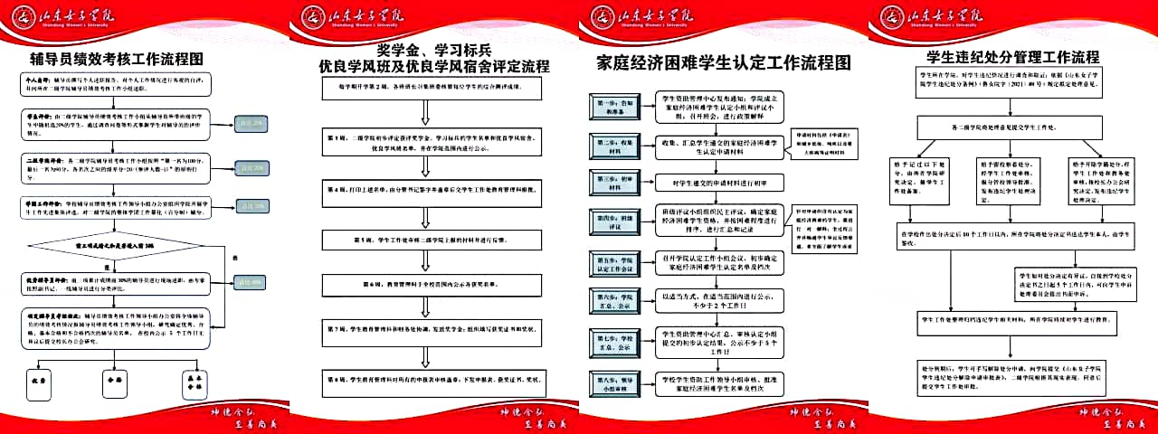二是开展流程再造,把制度优势转化为治理效能和服务水平。聚焦综合素质评价、奖学金评选等学生关切的热点问题,学生工作部(处)理清思路,抓纲带目,力求手续最简、环节最少,制定52项工作流程图。其中对学生办理频率高的经济资助、评奖评优等方面的流程图挂墙公示,让学生“一图读懂”,高效办理;同时先后召开4次辅导员校内业务培训会,对各科室具体办理流程进行系统解读,要求各学院辅导员及时掌握,并积极向学生宣传推广。