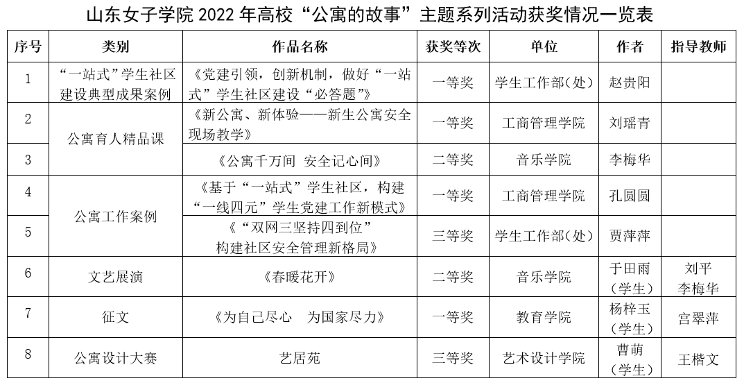 近日,由山东省教育厅主办的2022 年高校“公寓的故事”主题系列活动评选结果揭晓,学校师生分别在7个类别中获奖8项,其中一等奖4项、二等奖2项、三等奖2项;同时学校分获优秀组织奖、高校公寓管理先进单位荣誉称号。