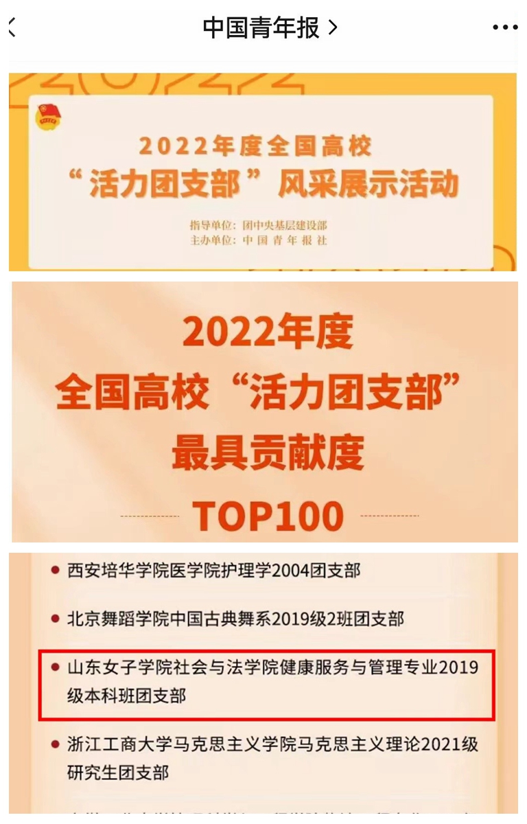 经过校内选树、校级展示、省级展示、全国展示等环节,社会与法学院健康服务与管理专业2019级本科班团支部荣获2022年度全国高校最具贡献度“活力团支部”。