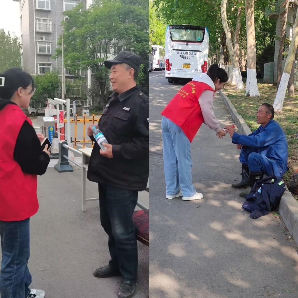 “大爷,天气这么热,看您工作了这么长时间,给您送瓶水”“阿姨,您工作多久了,我能帮您做点什么吗?”在我们的身边,每天都有大量的基层劳动者在默默工作着,学生们将眼光聚焦在这些既陌生又熟悉的身影上,主动走进他们,交流聊天、赠送心意、协助工作......感受基层工作的琐碎与辛苦,表达敬佩和关怀之心,送去节日祝福。