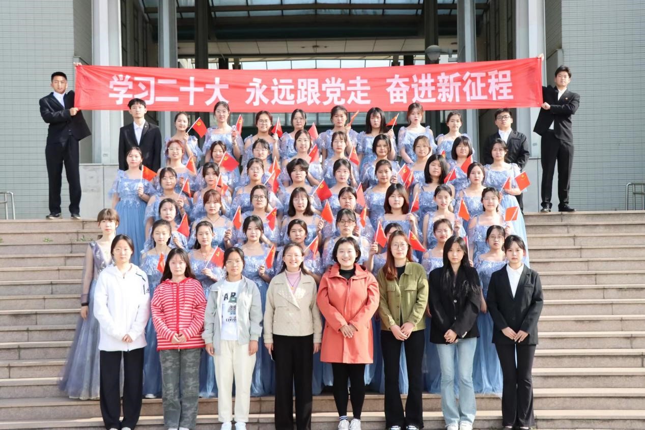 经济学院合唱团挥舞着手中鲜艳的国旗,共同唱响《山东女子学院校歌》,歌声伴朝阳,水木湛清华,经彩青年将以百倍的信心、十足的干劲迈向新征程。