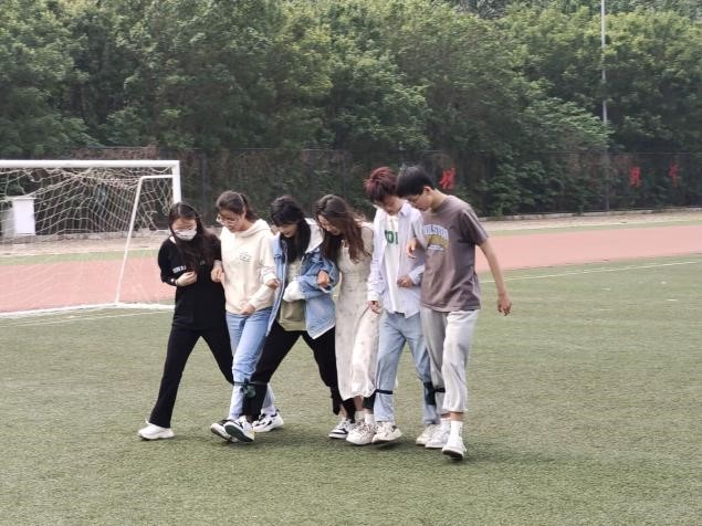 将相邻两人的腿绑到一起,这一比赛环节集智慧、速度、团结、毅力为一体。伴随着“一二、一二”的口号,队员们配合默契,一起抵达成功的彼岸。