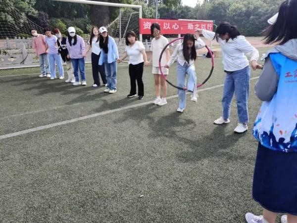 所有人依次让呼啦圈穿过自己,全程不能松手,不能用手触碰呼啦圈。同心合力,庶几有成。队员们动作灵活,配合默契,呼啦圈行云流水般流转。