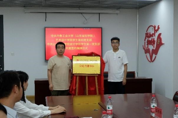 座谈会上,齐鲁工业大学艺术设计学院党委副书记刘悦首先介绍了艺术设计学院党建工作的基本情况及学院的专业特色。随后双方党支部书记分别介绍了支部基本建设思路,党建工作特色等,并结合学习贯彻习近平新时代中国特色社会主义思想主题教育开展情况,从支部工作、专业特色等方面进行了交流分享,通过交流,取长补短,互学互鉴,共谋发展。交流结束后,于志与齐鲁工业大学艺术设计学院学生第四党支部书记陈健,共同为此次支部共联共建揭牌。