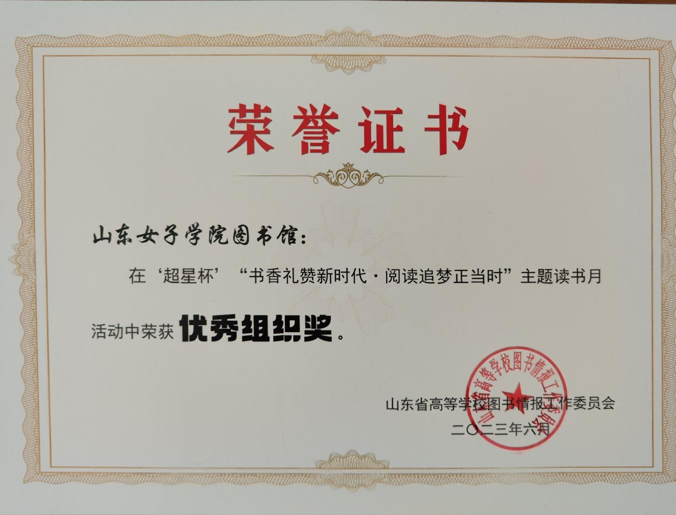 近日,“书香礼赞新时代·阅读追梦正当时”山东省高校“超星杯”阅读活动圆满落幕,学校图书馆在本次活动中组织得力,师生参与度高,最终荣获“优秀组织奖”,薛媛媛等六名同学获得一等奖1项、 五等奖5项。据悉,大赛共有74所院校的9812名学生参加。