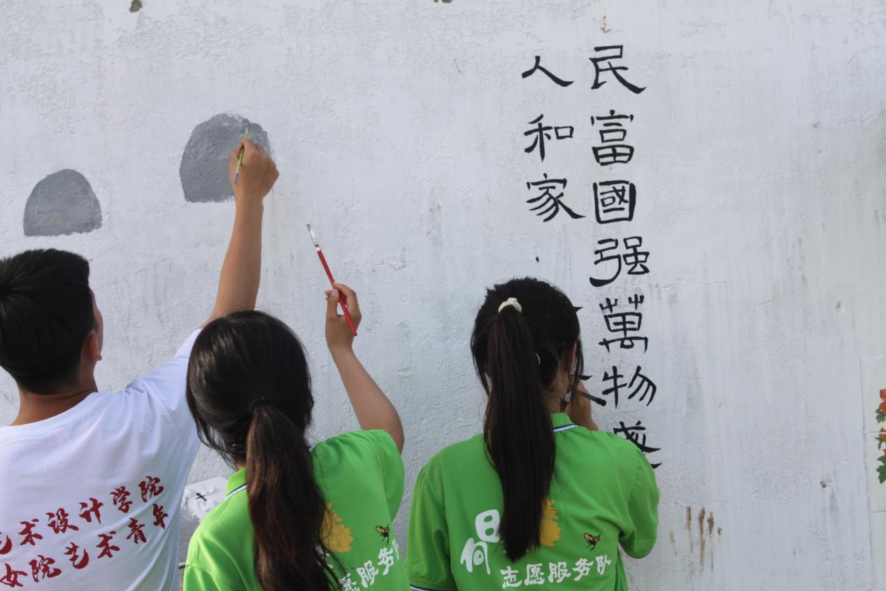 “向日葵”志愿者走进乡村,学农事、干农活、体验乡村生活。在省派第一书记的带领下,志愿者学习了葡萄种植以及家畜饲养的相关知识,帮助村民进行种植园管理、采摘和葡萄产品包装,通过电商、直播等新型信息传播技术为村民设计开发了葡萄销售新渠道。结合冉堌镇的文化特色,发挥想象,运用绘画技巧描绘七彩乡村、农耕文化,助力当地村居环境的美化。